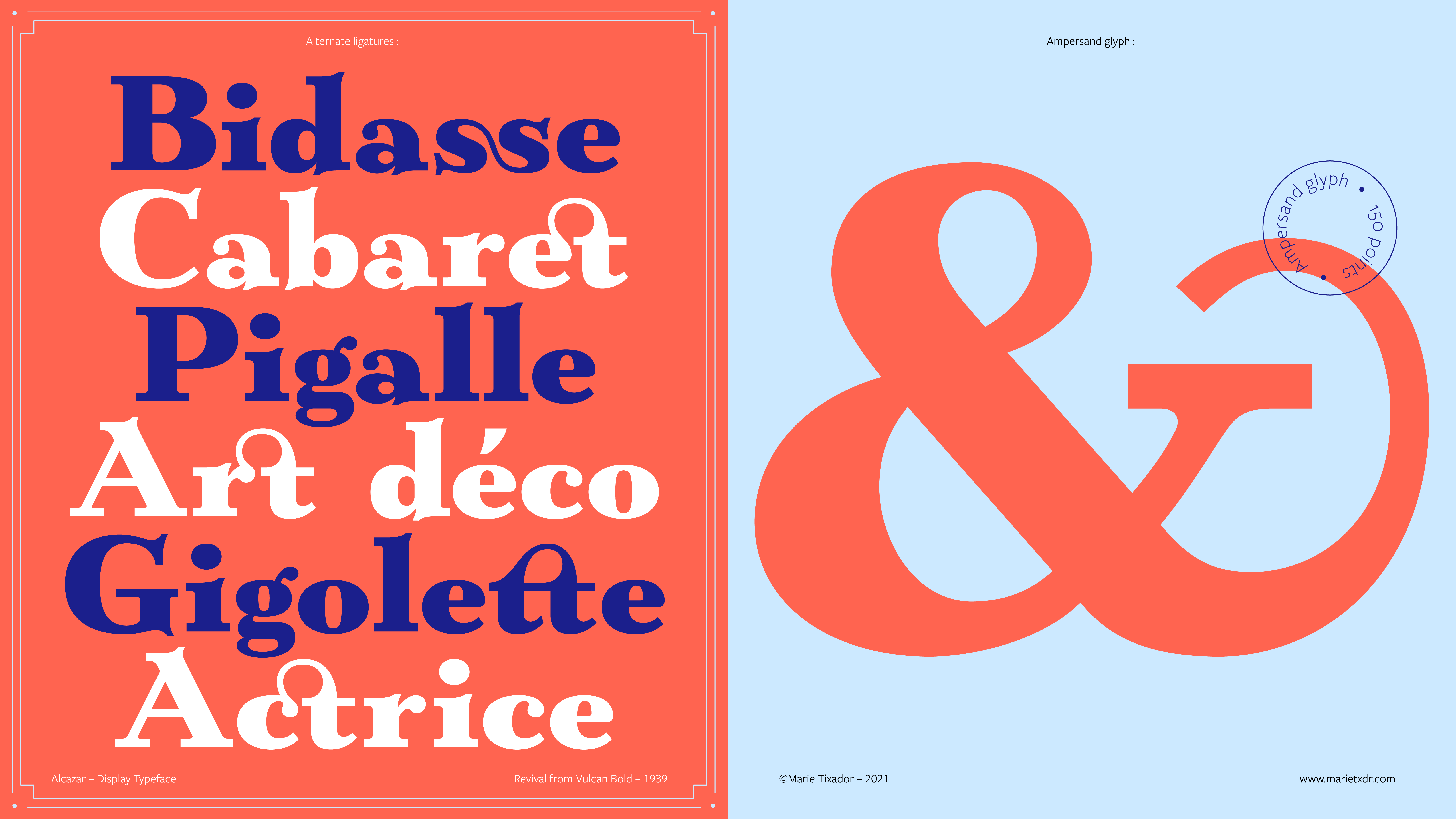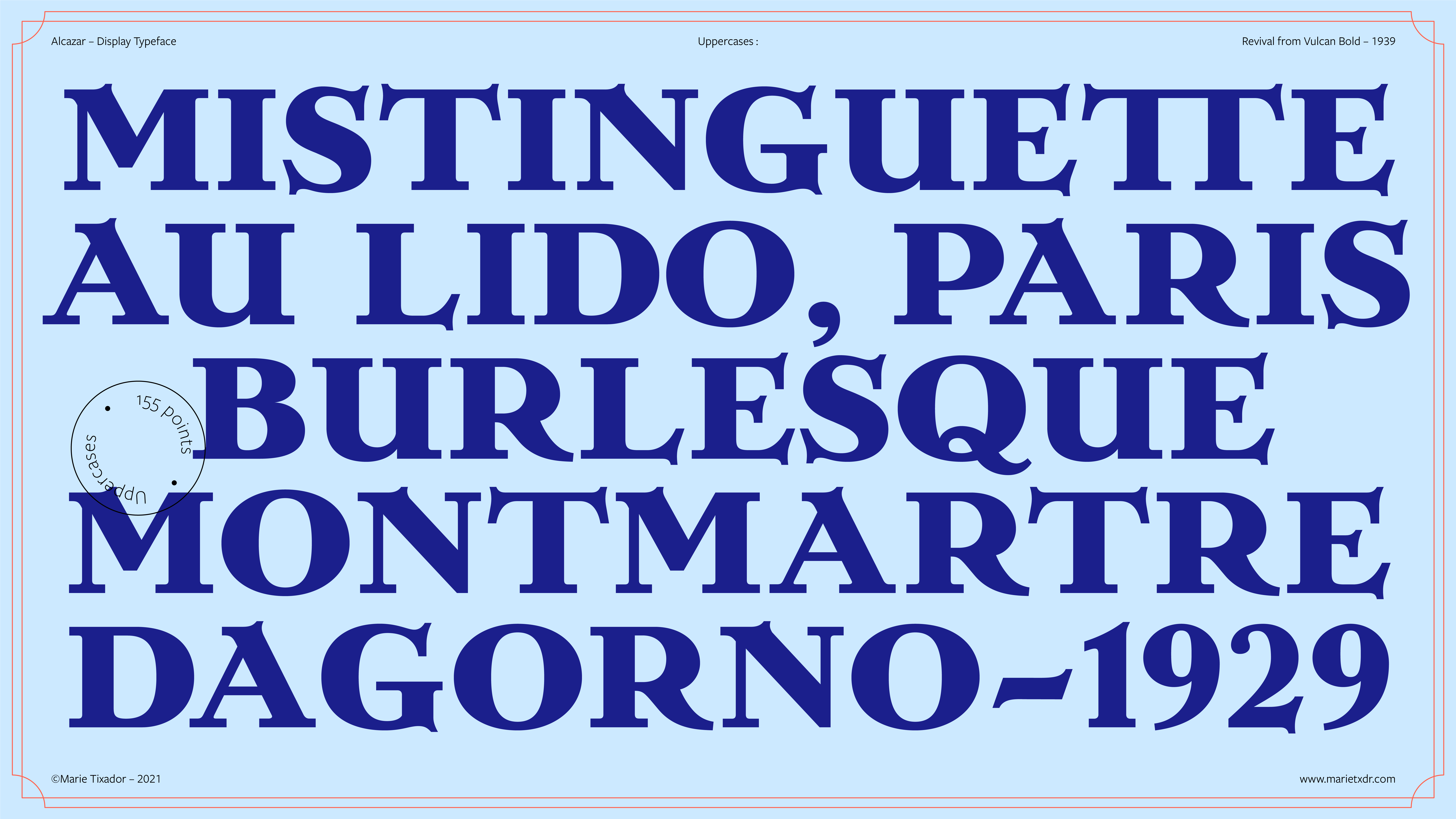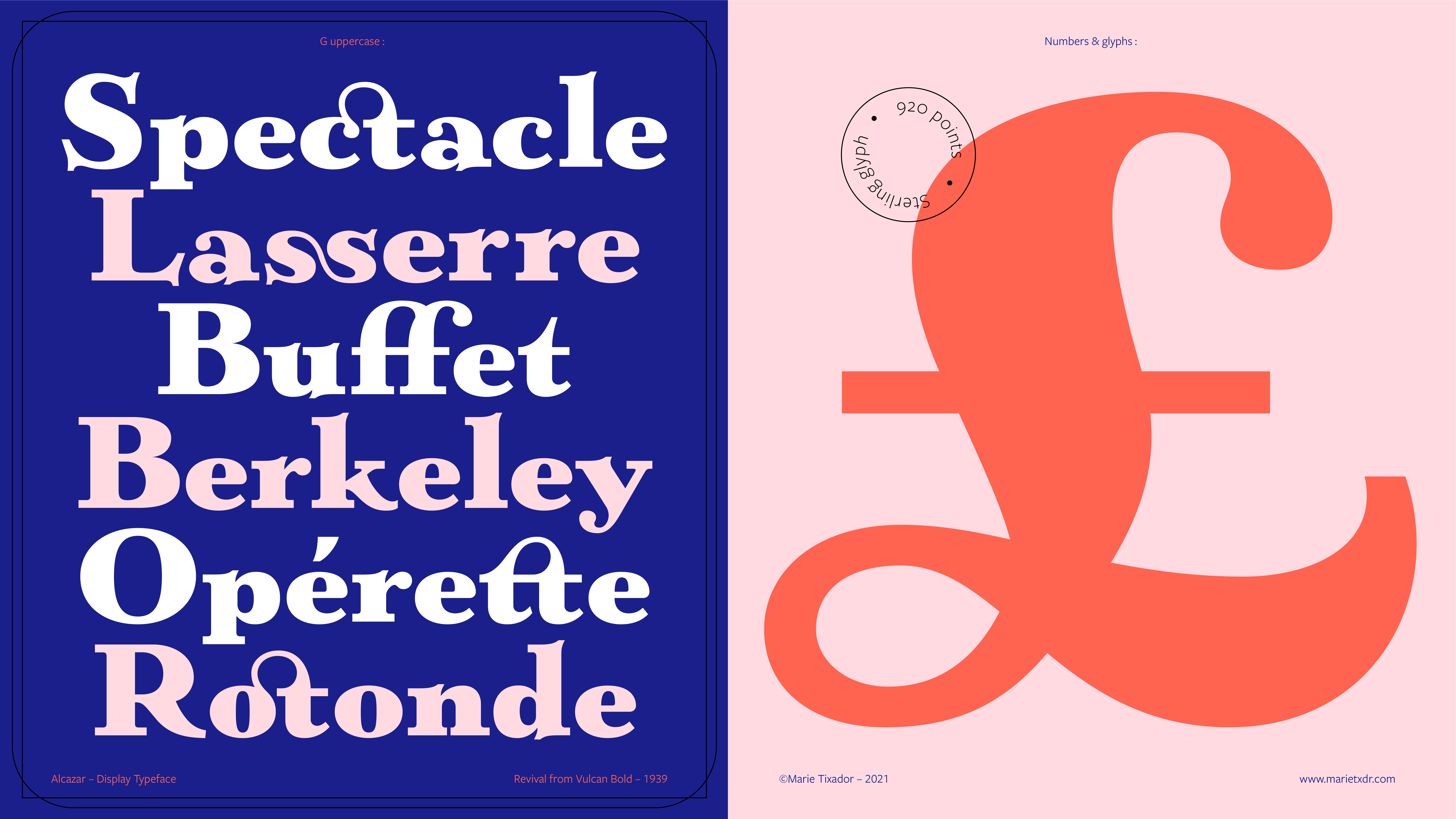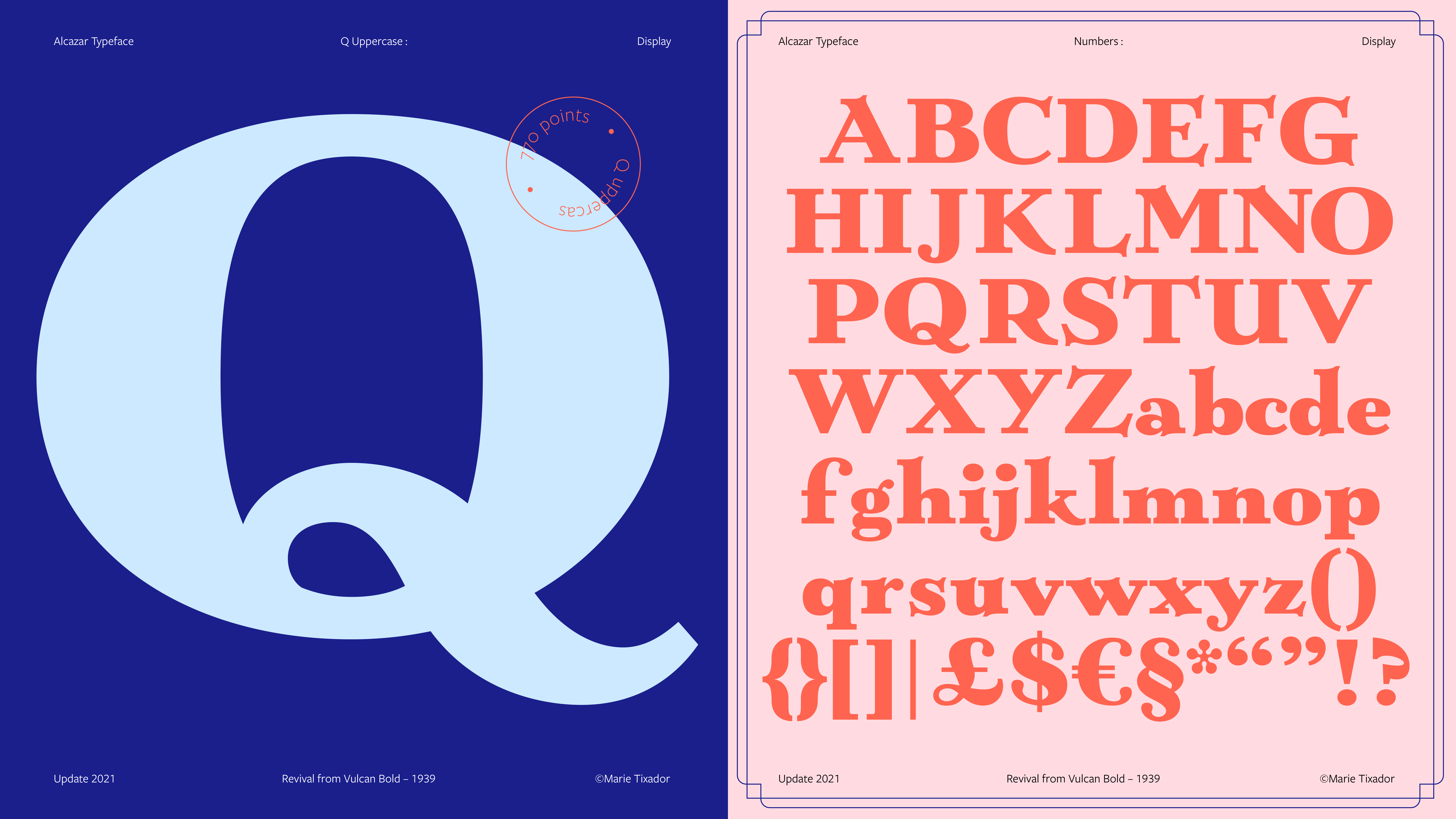 Vulcan Bold display typeface's revival, designed by the Linotype foundry in 1939. After several drawings on layers, Alcazar was developed between 2019 & 2020. It presents a big contrast and the serifs are very typical of Art Nouveau period. Modernized, this typeface is perfect for distinctive displays needs.