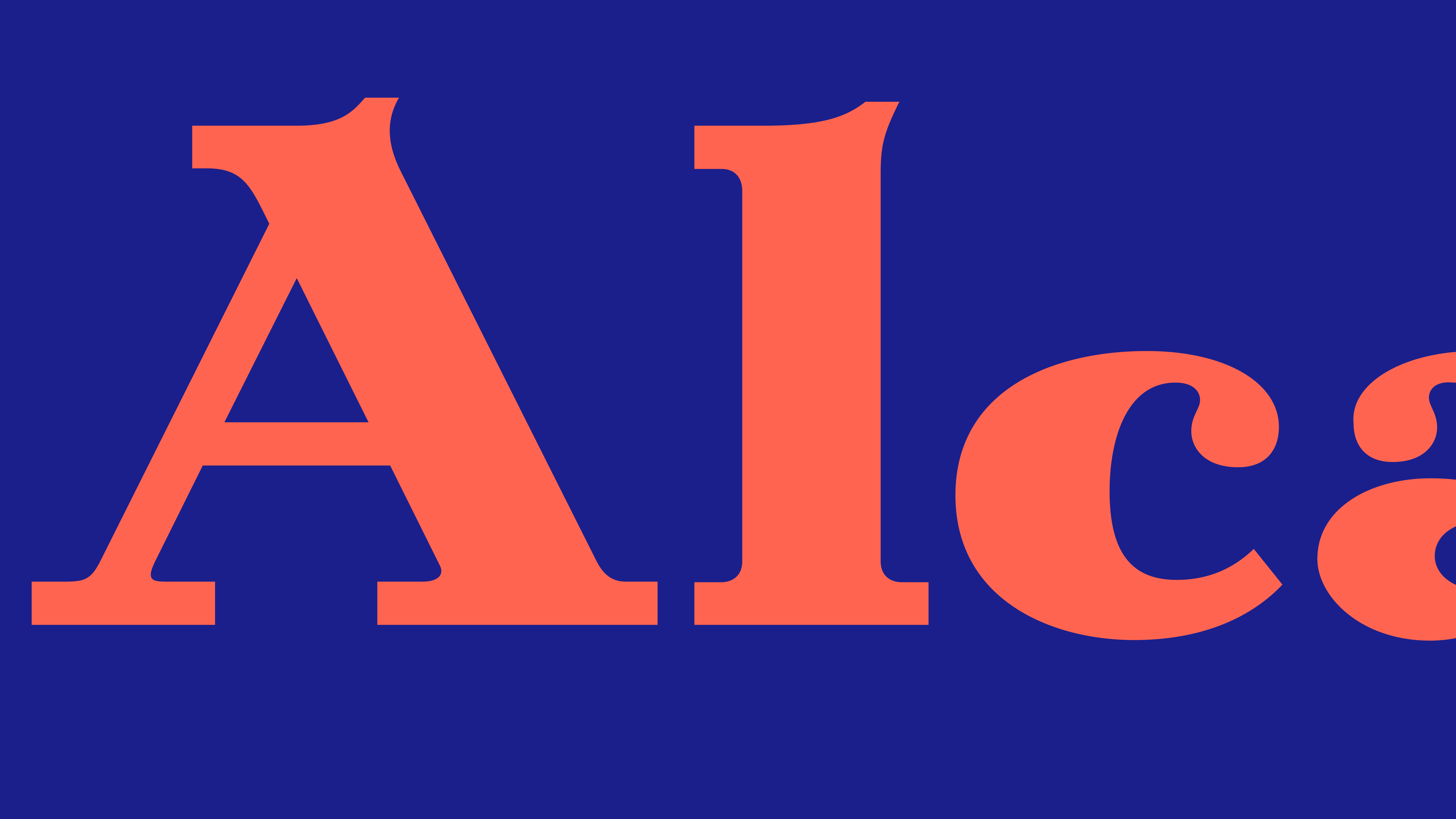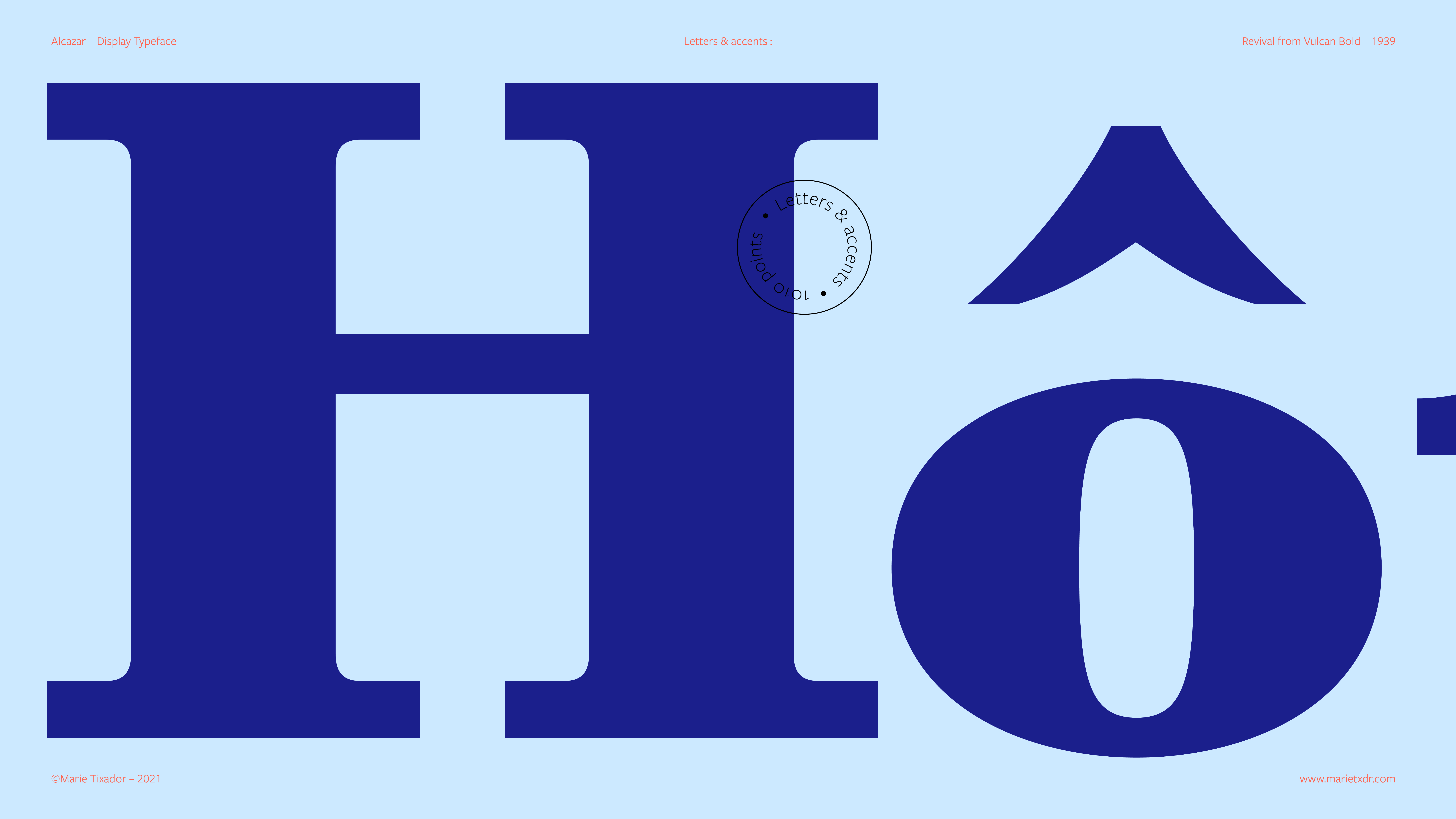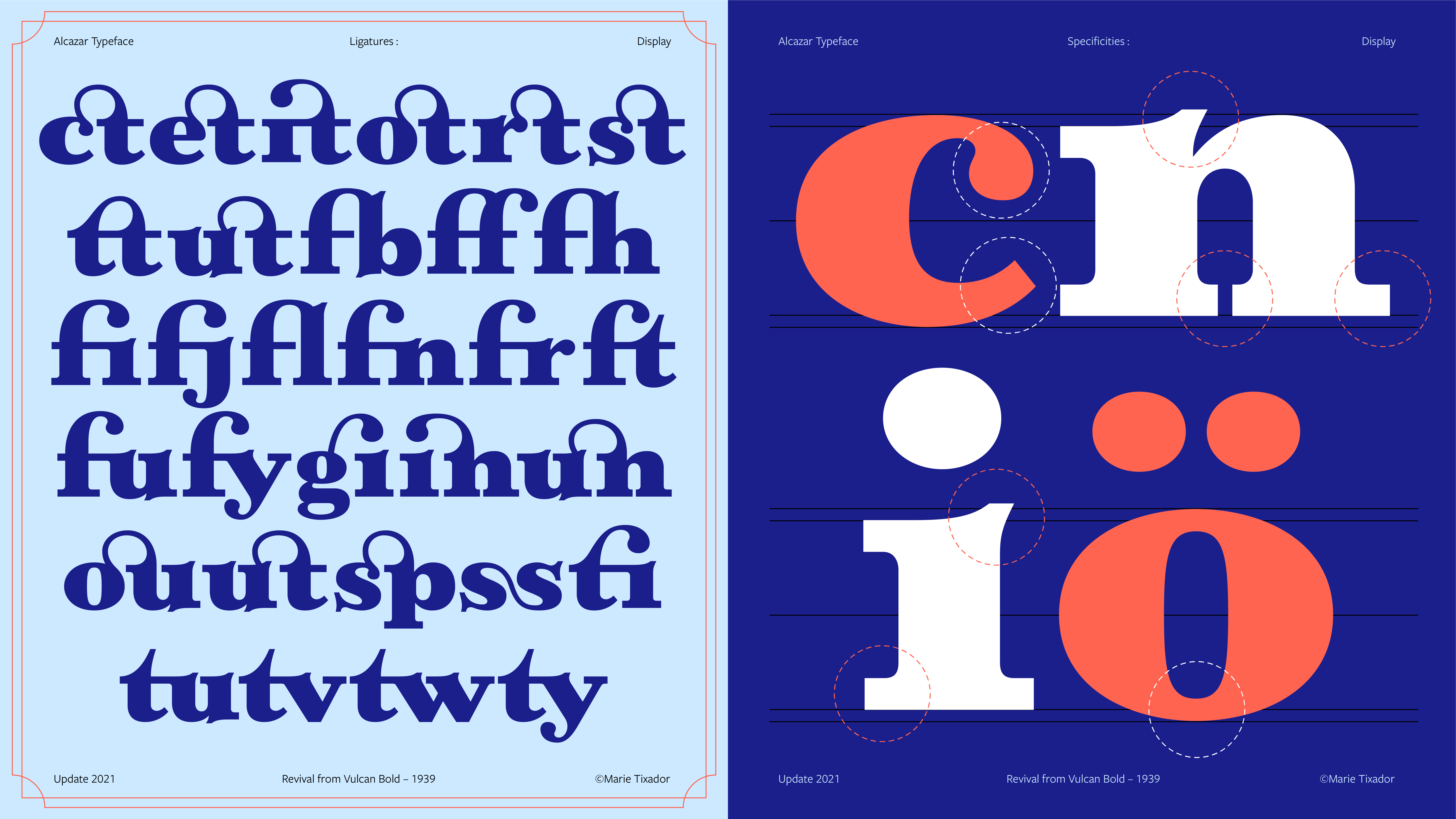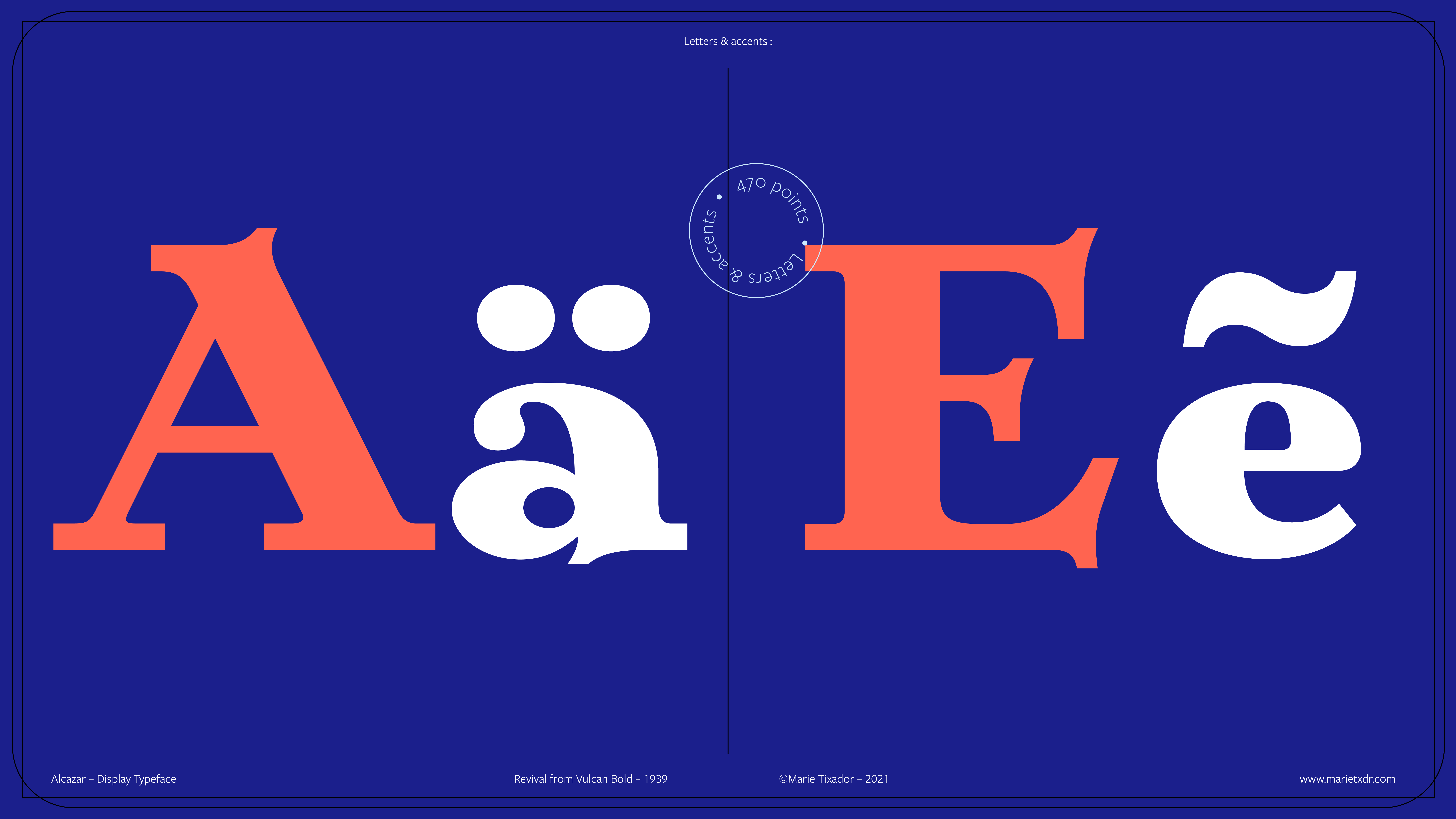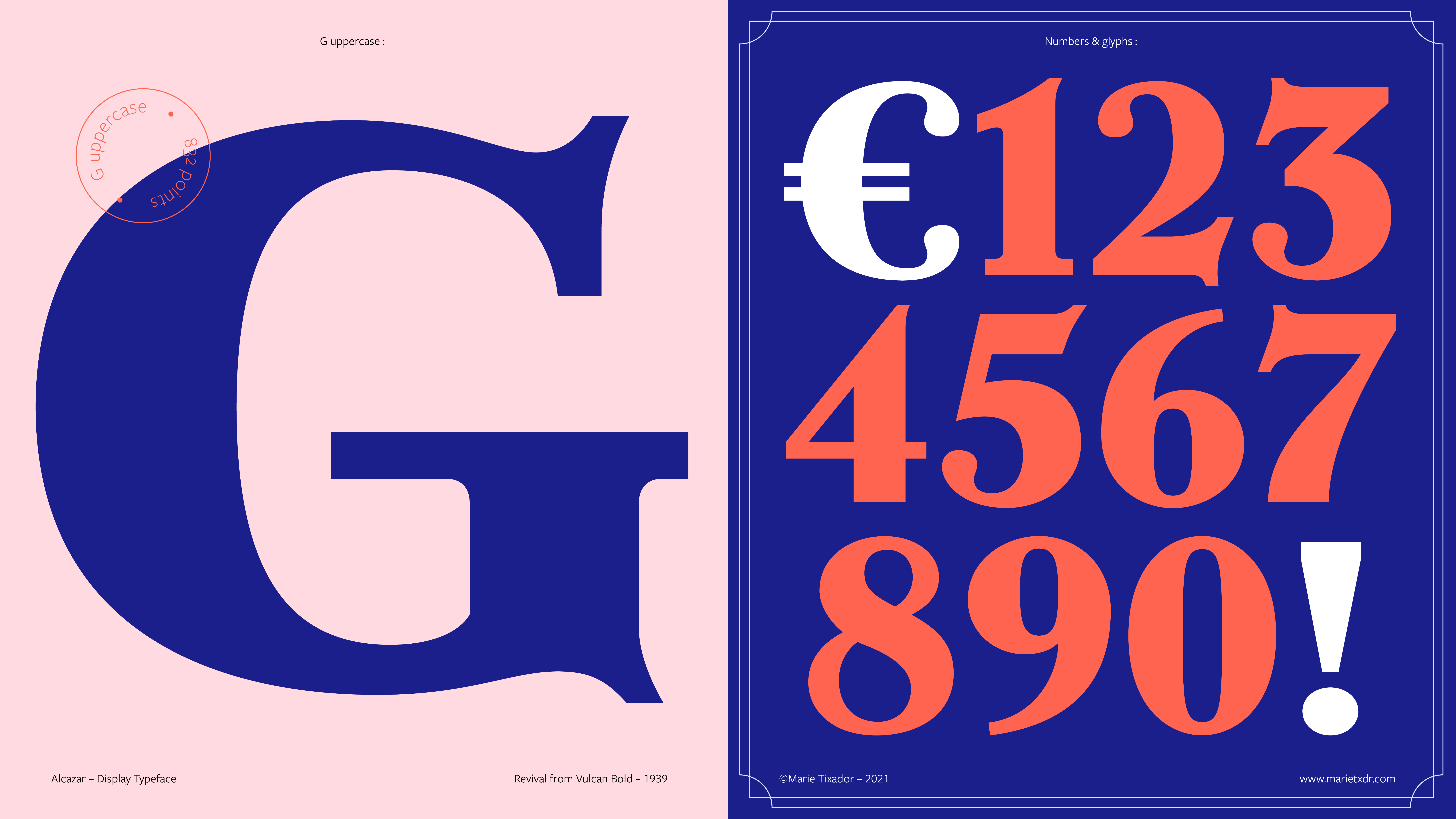 Vulcan Bold display typeface's revival, designed by the Linotype foundry in 1939. After several drawings on layers, Alcazar was developed between 2019 & 2020. It presents a big contrast and the serifs are very typical of Art Nouveau period. Modernized, this typeface is perfect for distinctive displays needs.